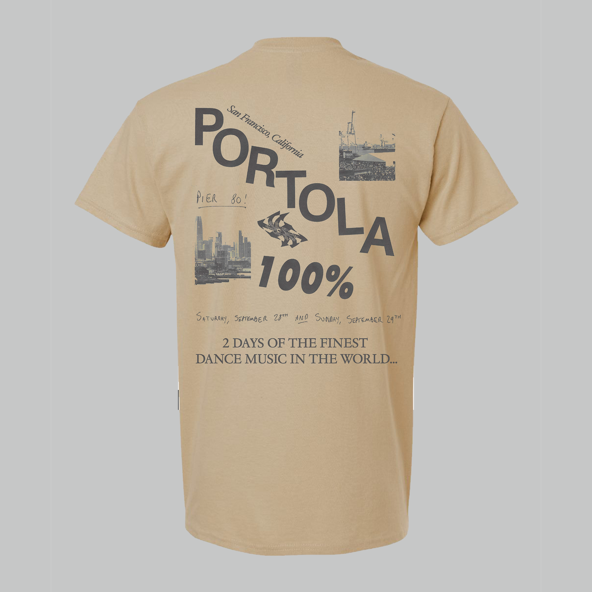 Celebrate 2 days of the finest dance music with this heavyweight tee in tan, featuring original Portola artwork printed on the front and back. 100% cotton. Unisex fit.