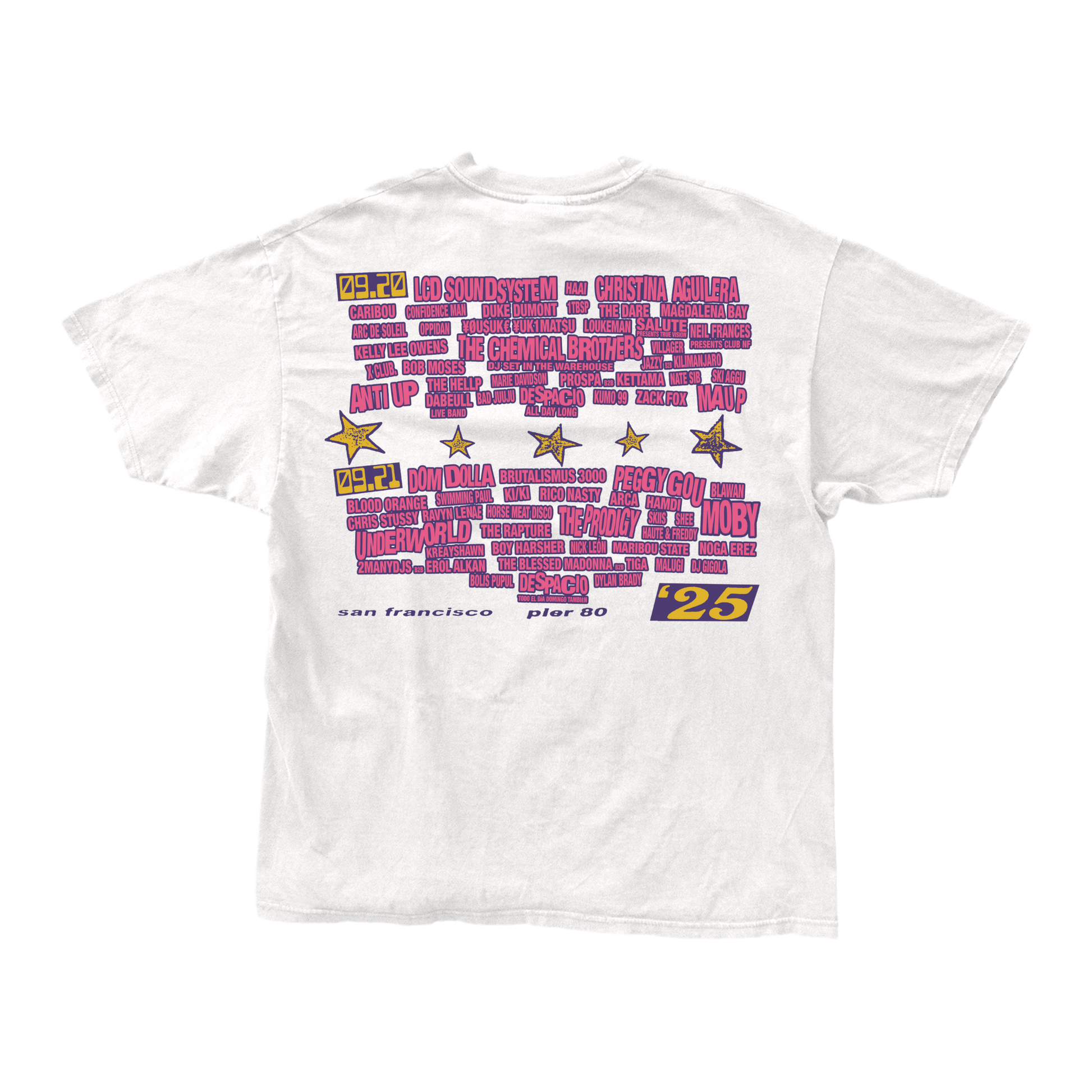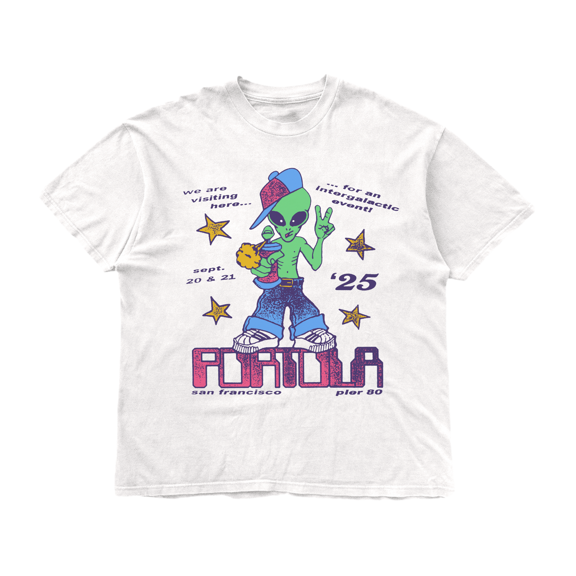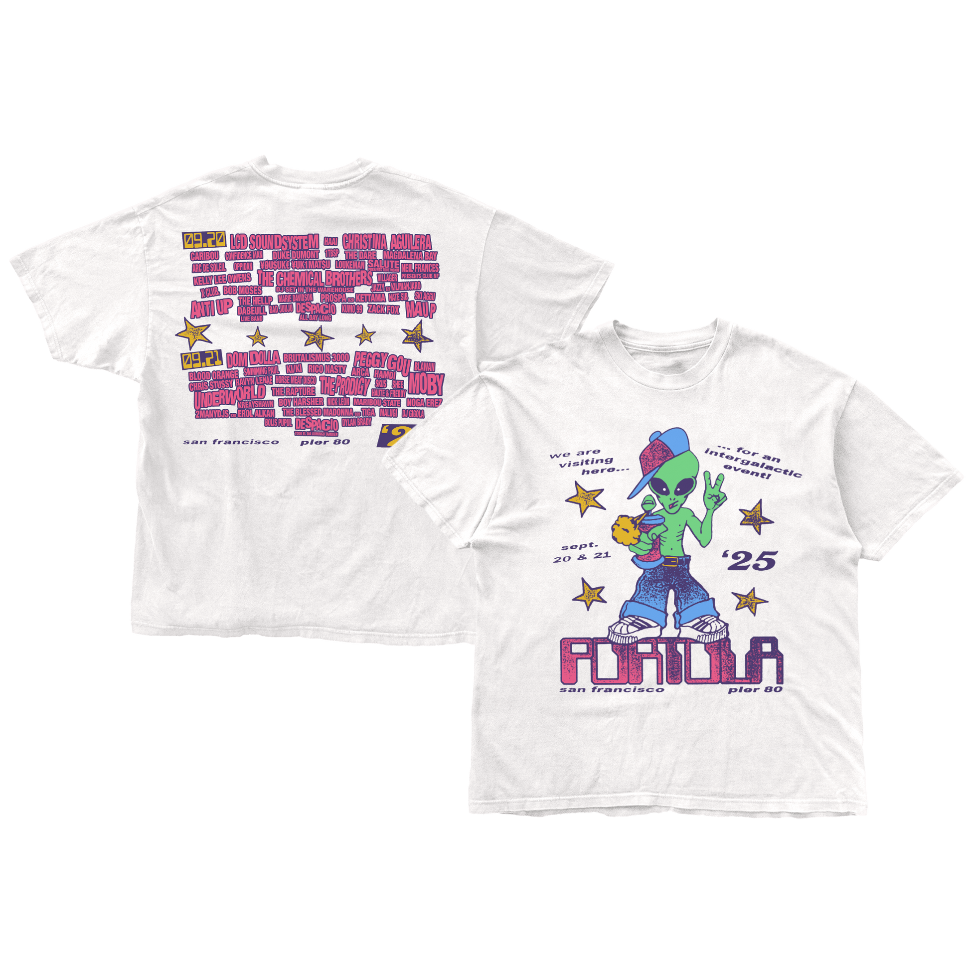 Heavyweight tee in white, featuring Intergalactic Visitor logo art printed on the front and the 2025 Portola lineup printed on the back. 100% Cotton. Unisex, relaxed fit.