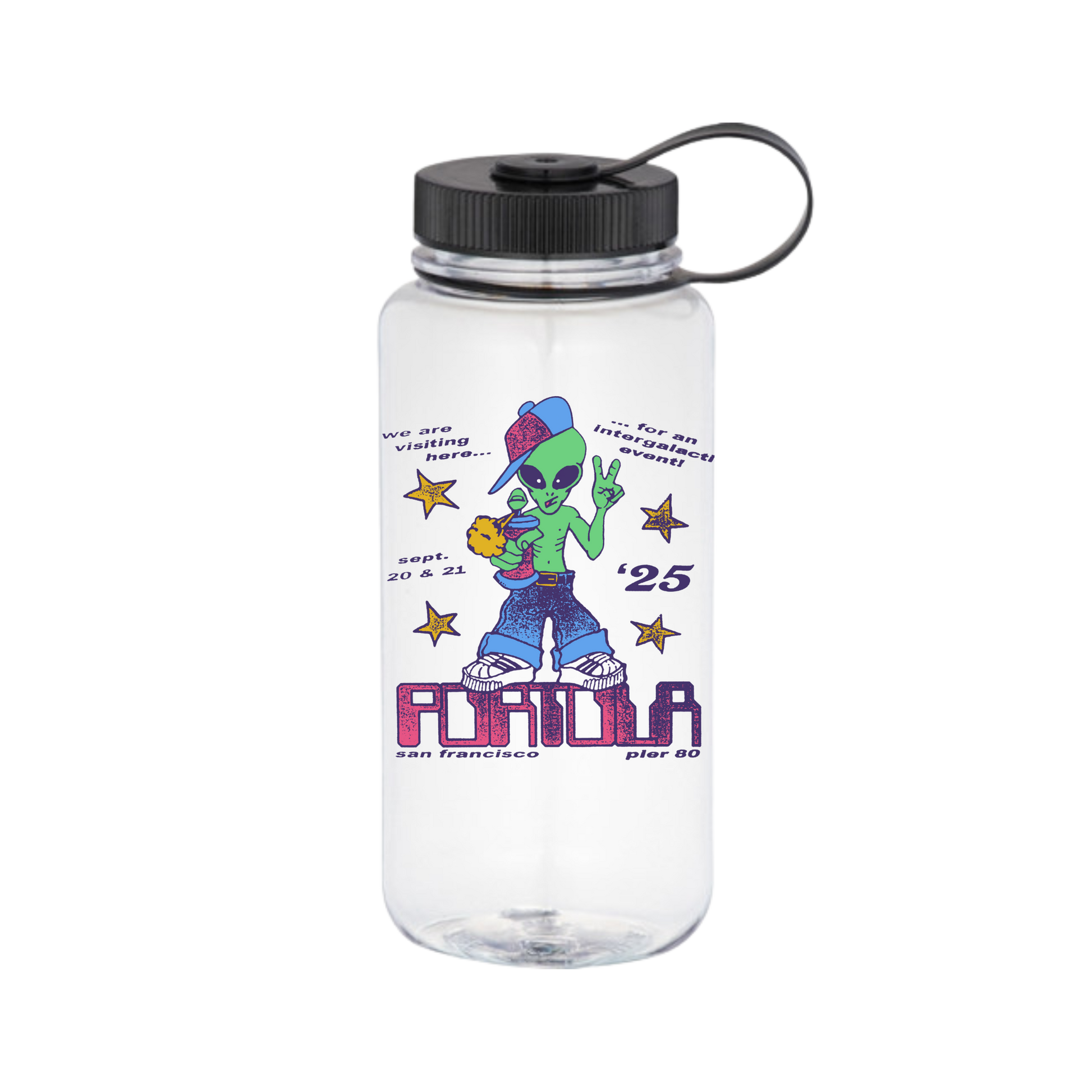 32 oz. clear water bottle, featuring Intergalactic Visitor logo art. Wide mouth opening. Screw on lid with strap.