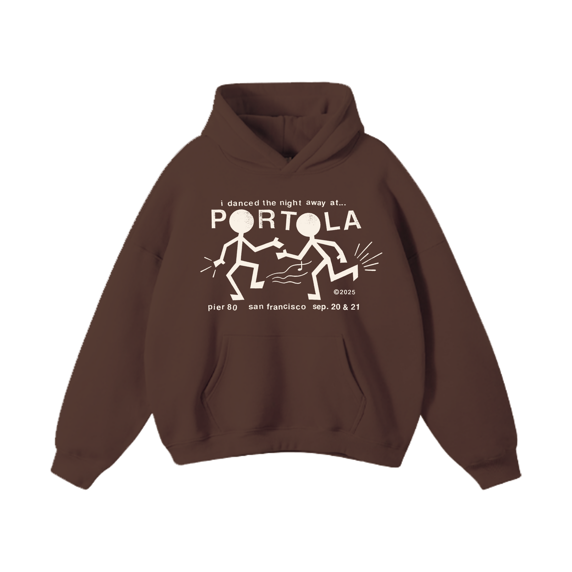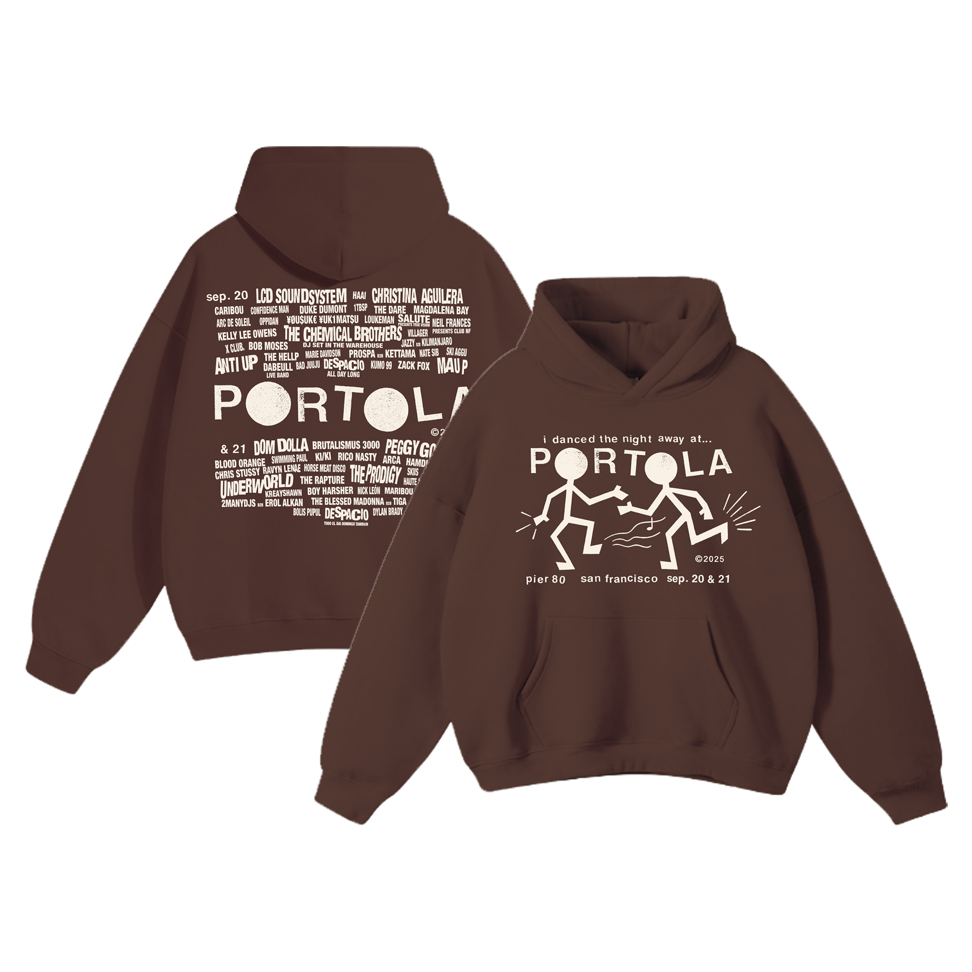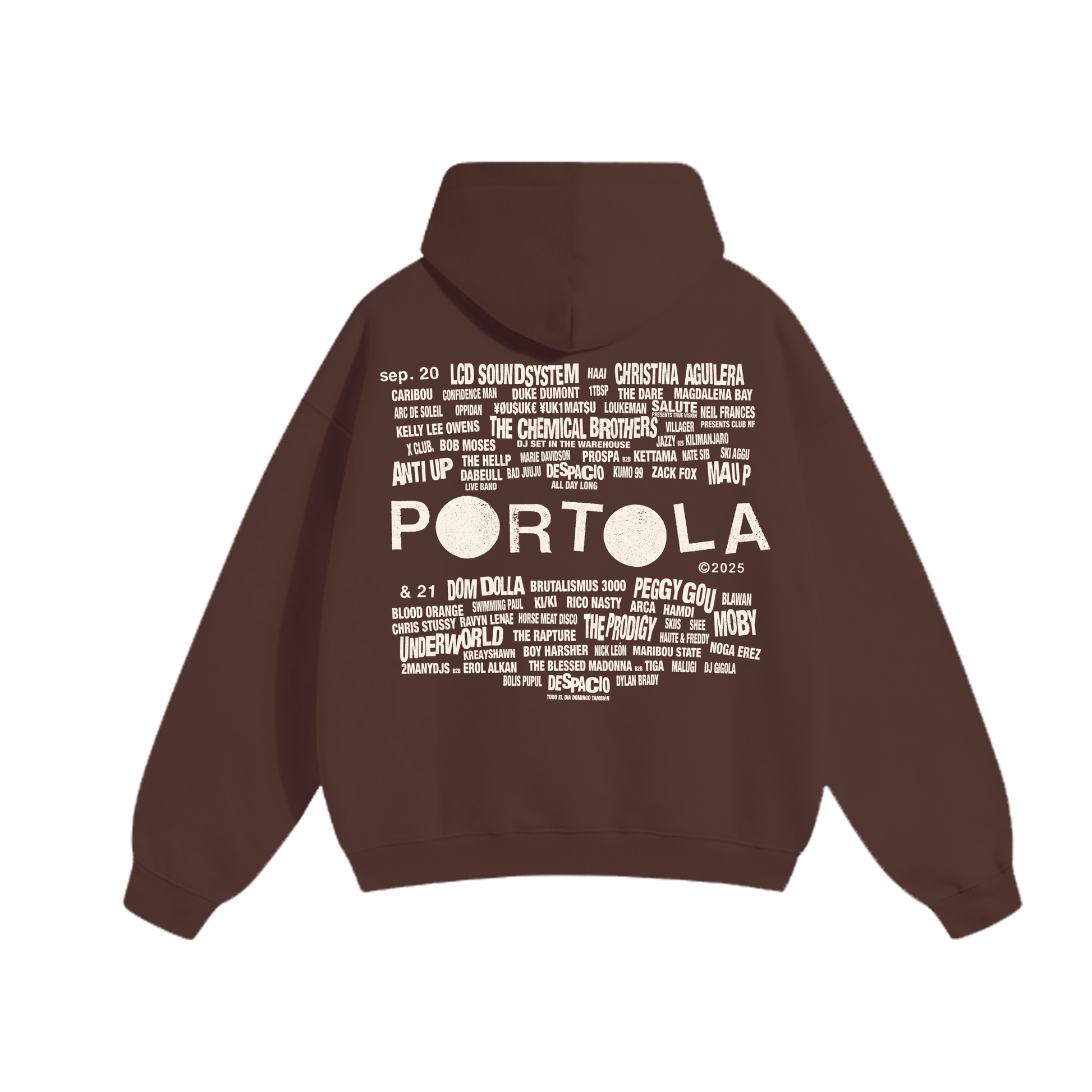 Heavyweight hoodie in brown, featuring Party People logo art printed on the front and the 2025 Portola lineup printed on the back. 75/25 cotton/polyester blend. Unisex, oversized fit.