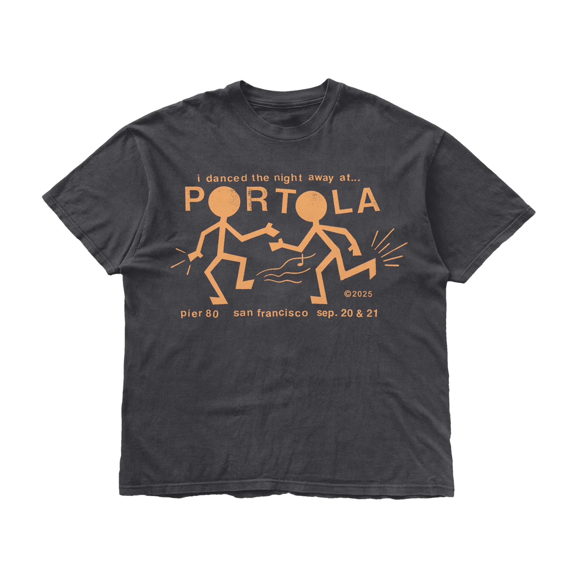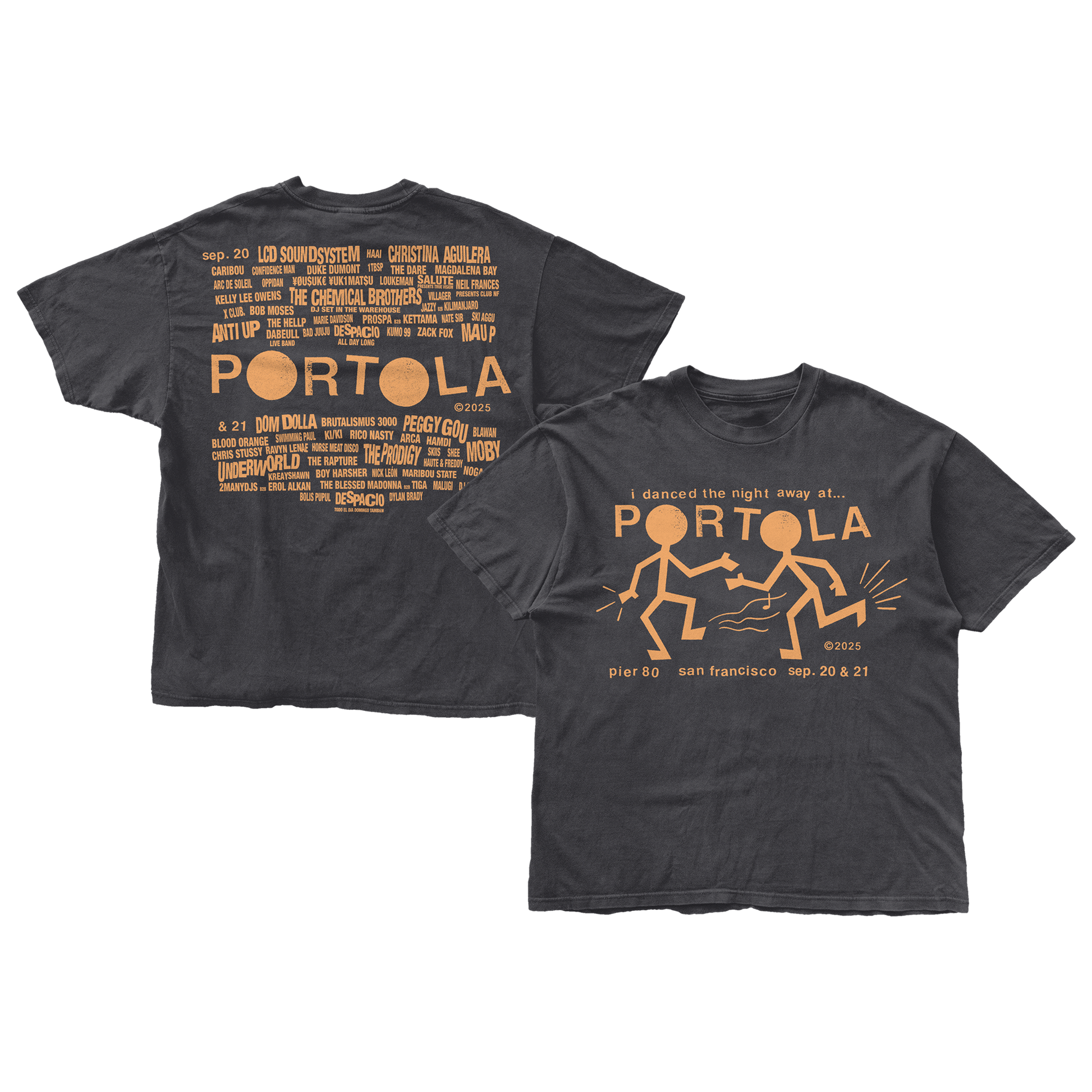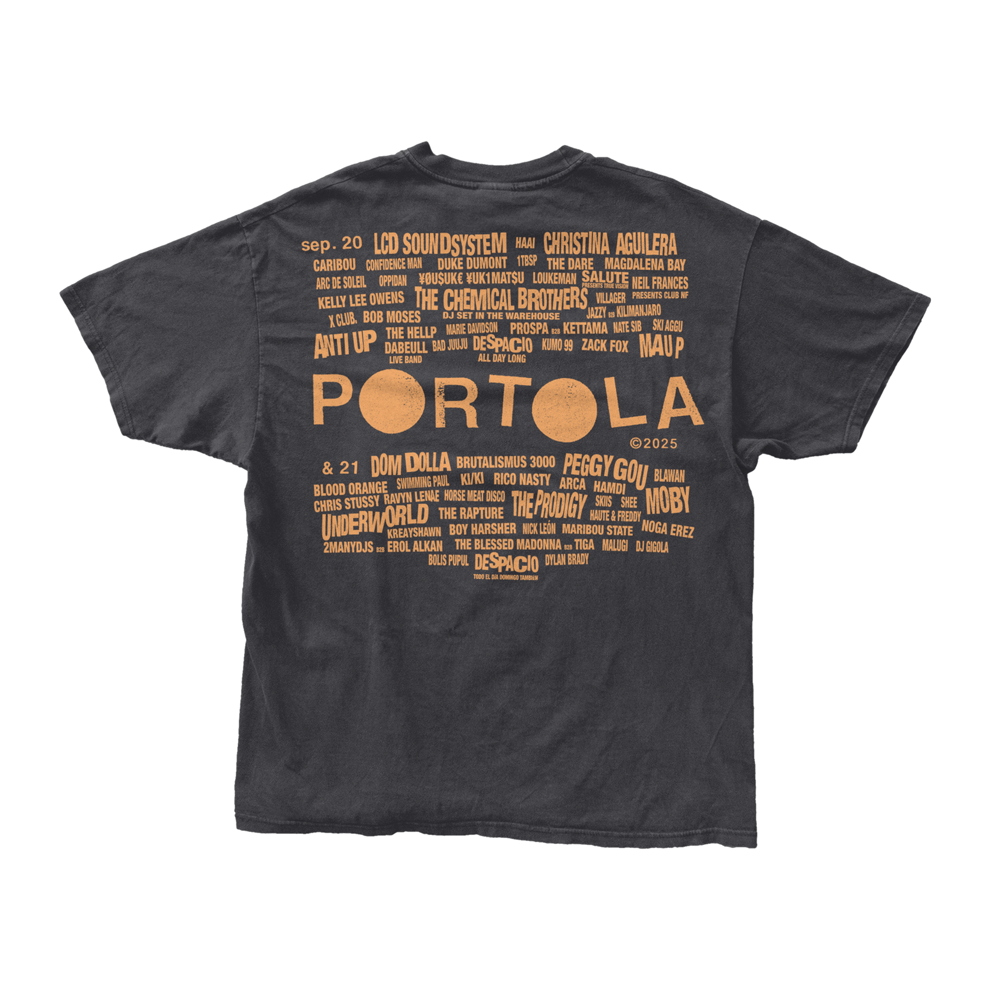 Heavyweight tee in dark grey, featuring Party People logo art printed on the front and the 2025 Portola lineup printed on the back. 100% Cotton. Unisex, relaxed fit.