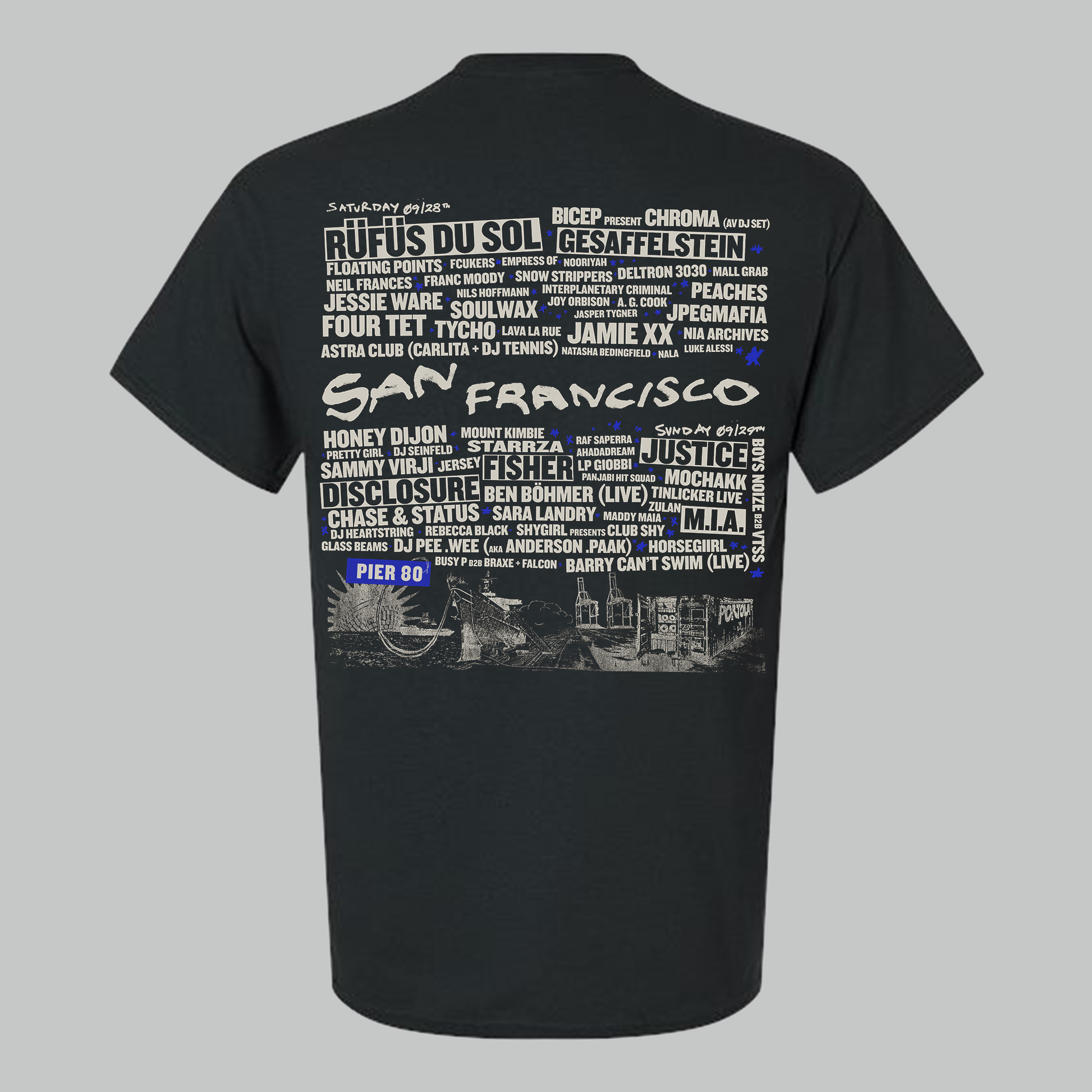 Heavyweight tee in black, featuring the Portola 2024 logo printed on the front left chest and lineup art printed on the back. 100% cotton. Unisex fit.