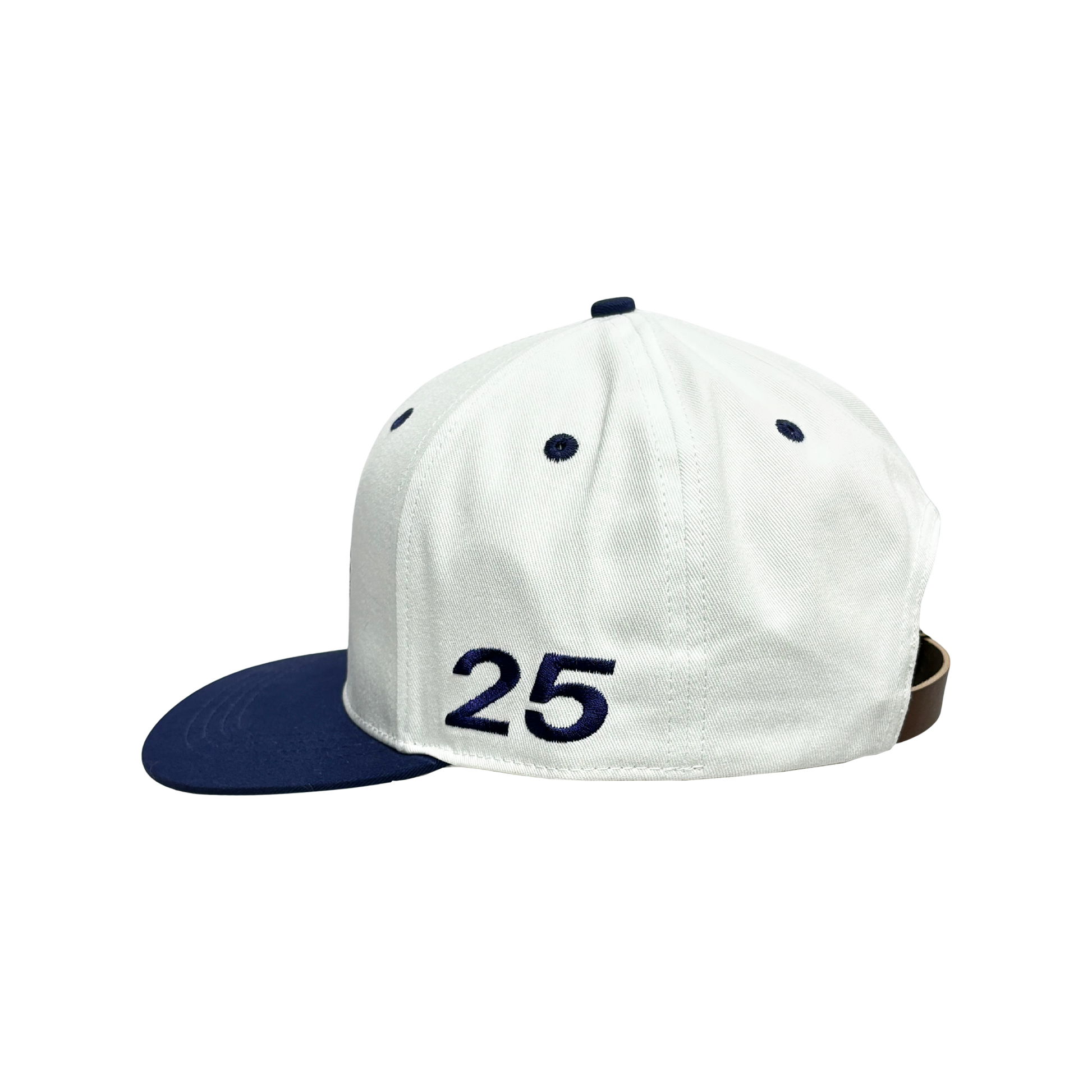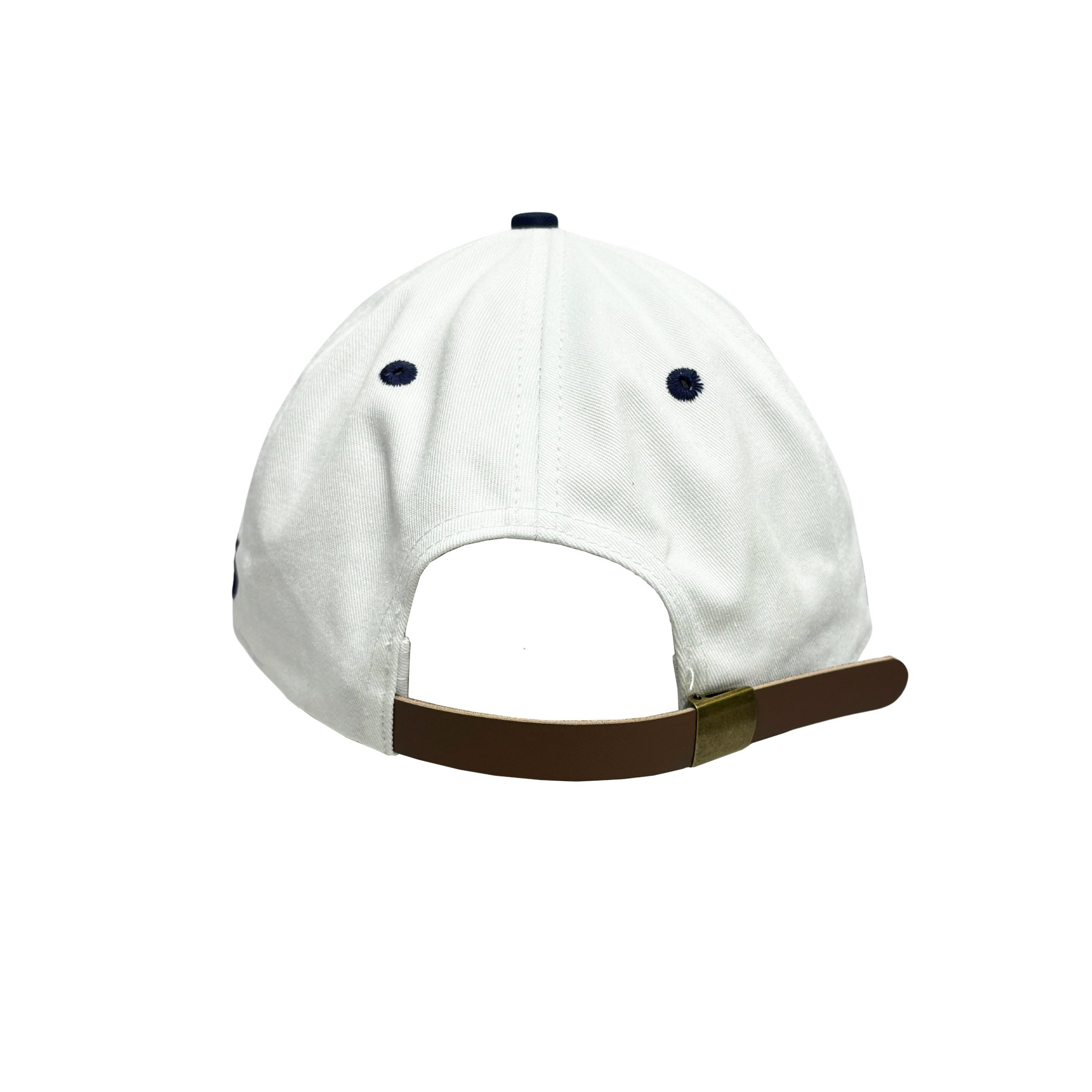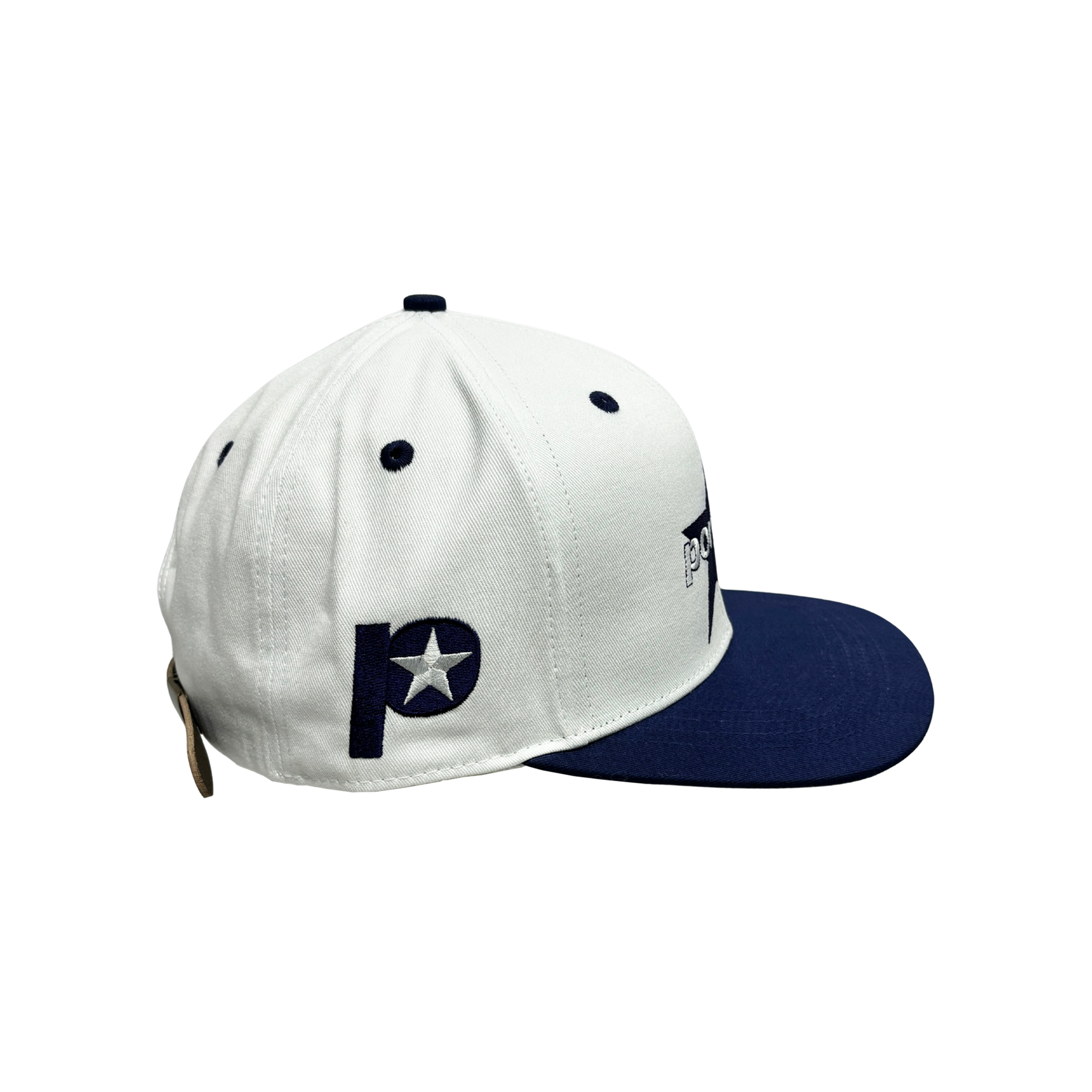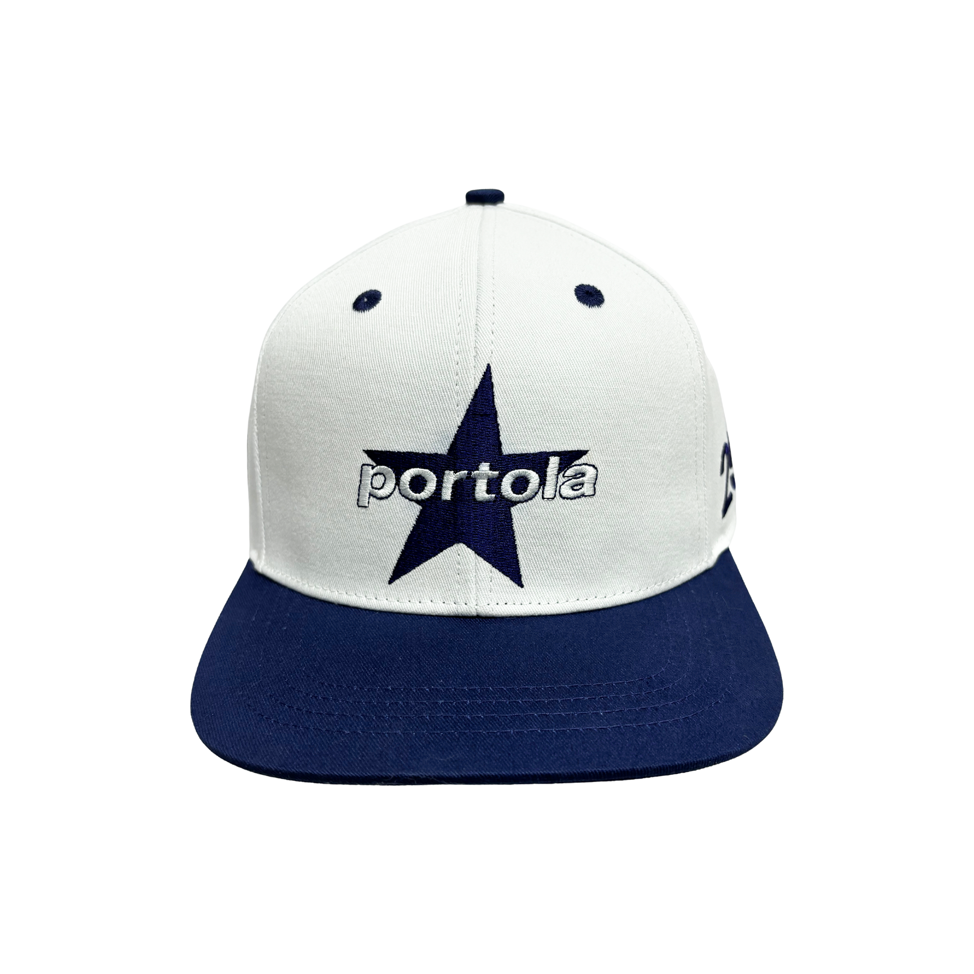 6-panel snapback hat in white / navy blue, featuring Portola Star logo art embroidered on the front and sides. Adjustable strap with metal clasp.