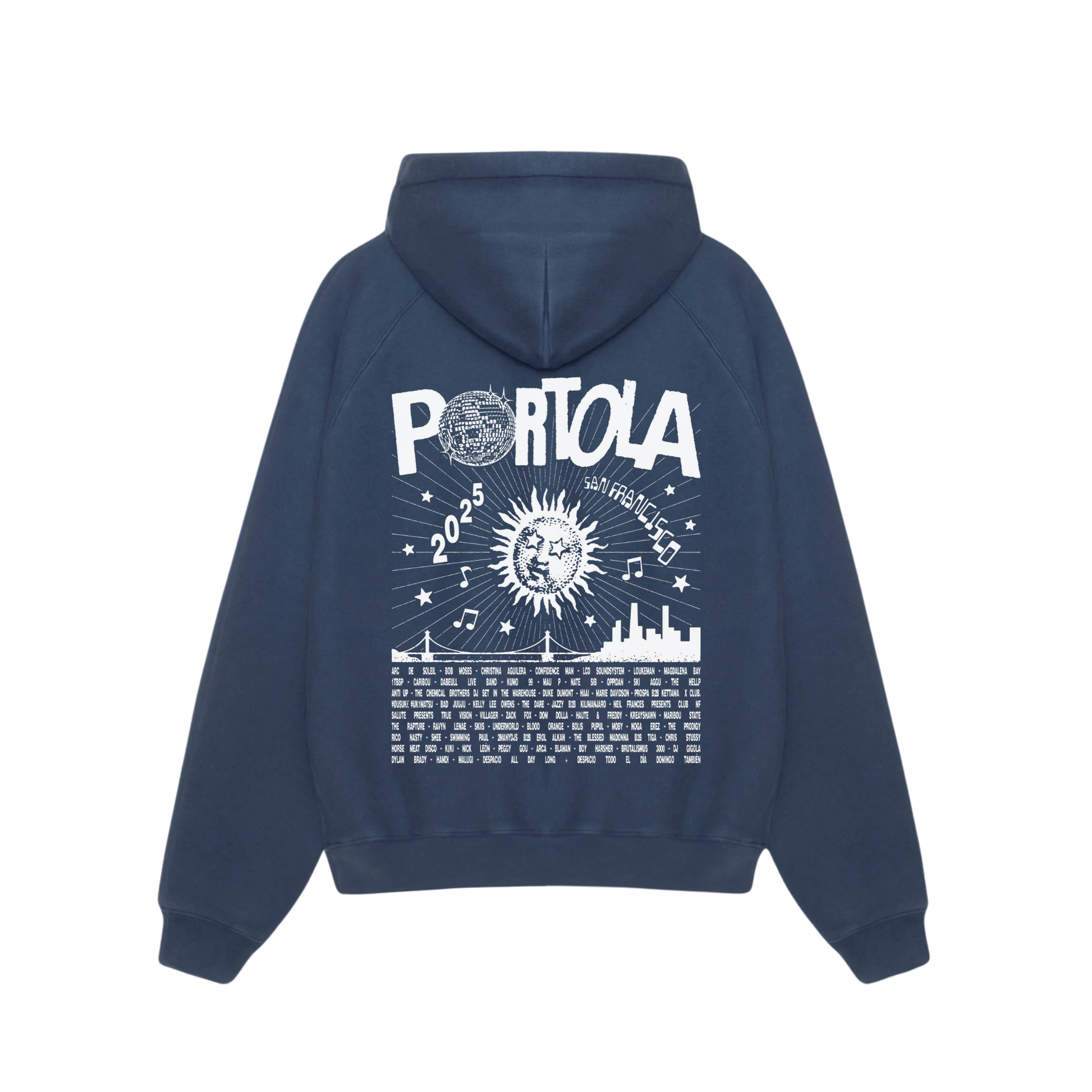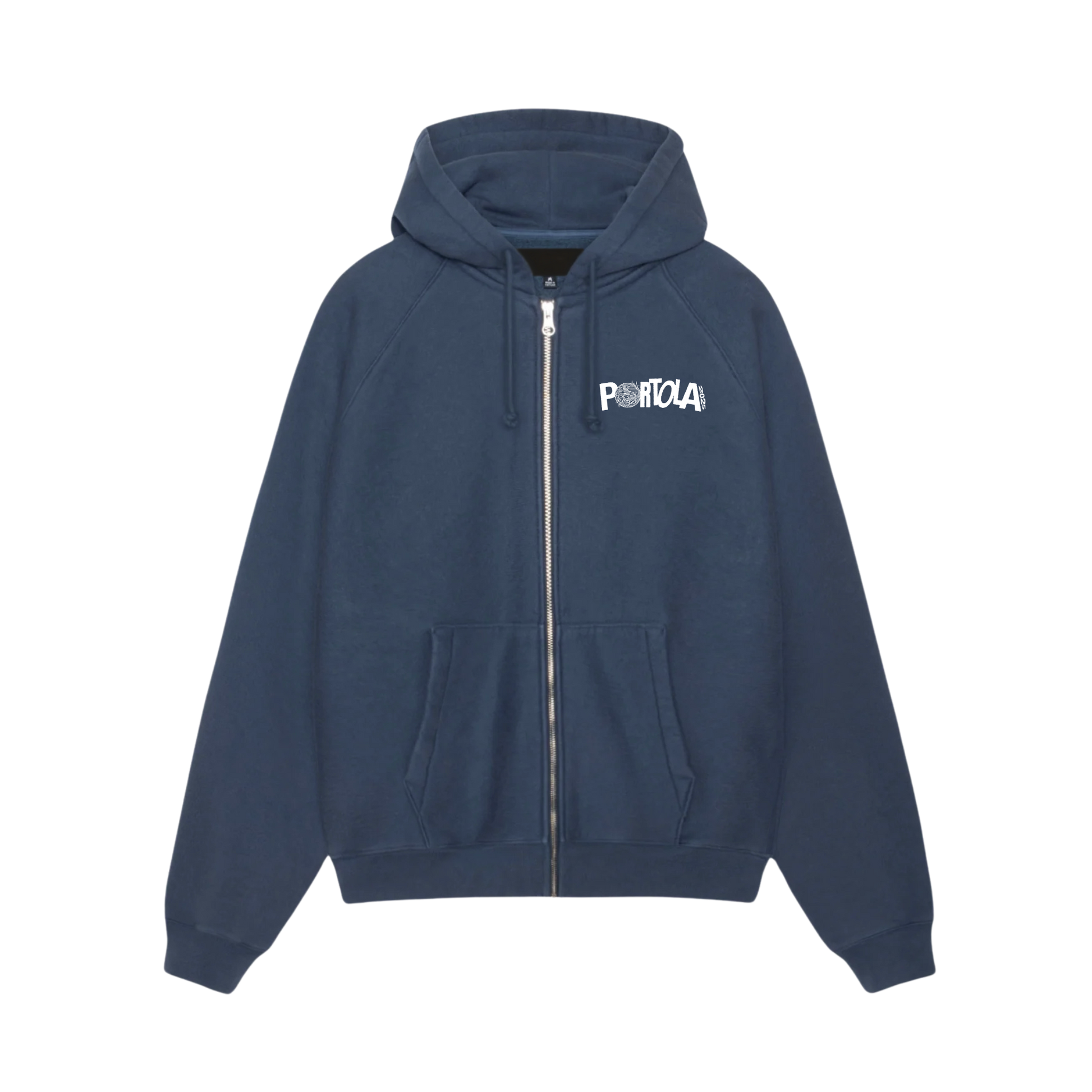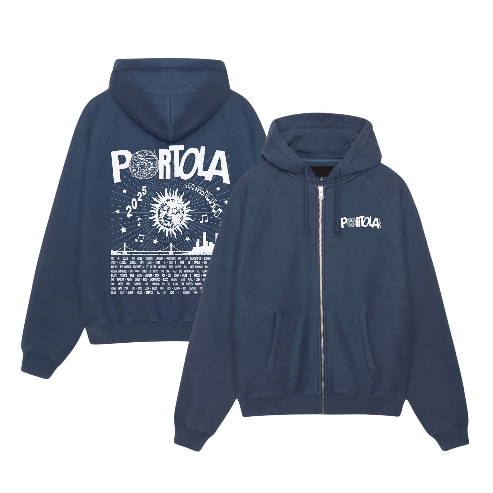 Heavyweight zip-up hoodie in navy, featuring Portola Sun logo art printed on the front and the 2025 Portola lineup printed on the back. 70/30 cotton/polyester blend. Unisex, relaxed fit.