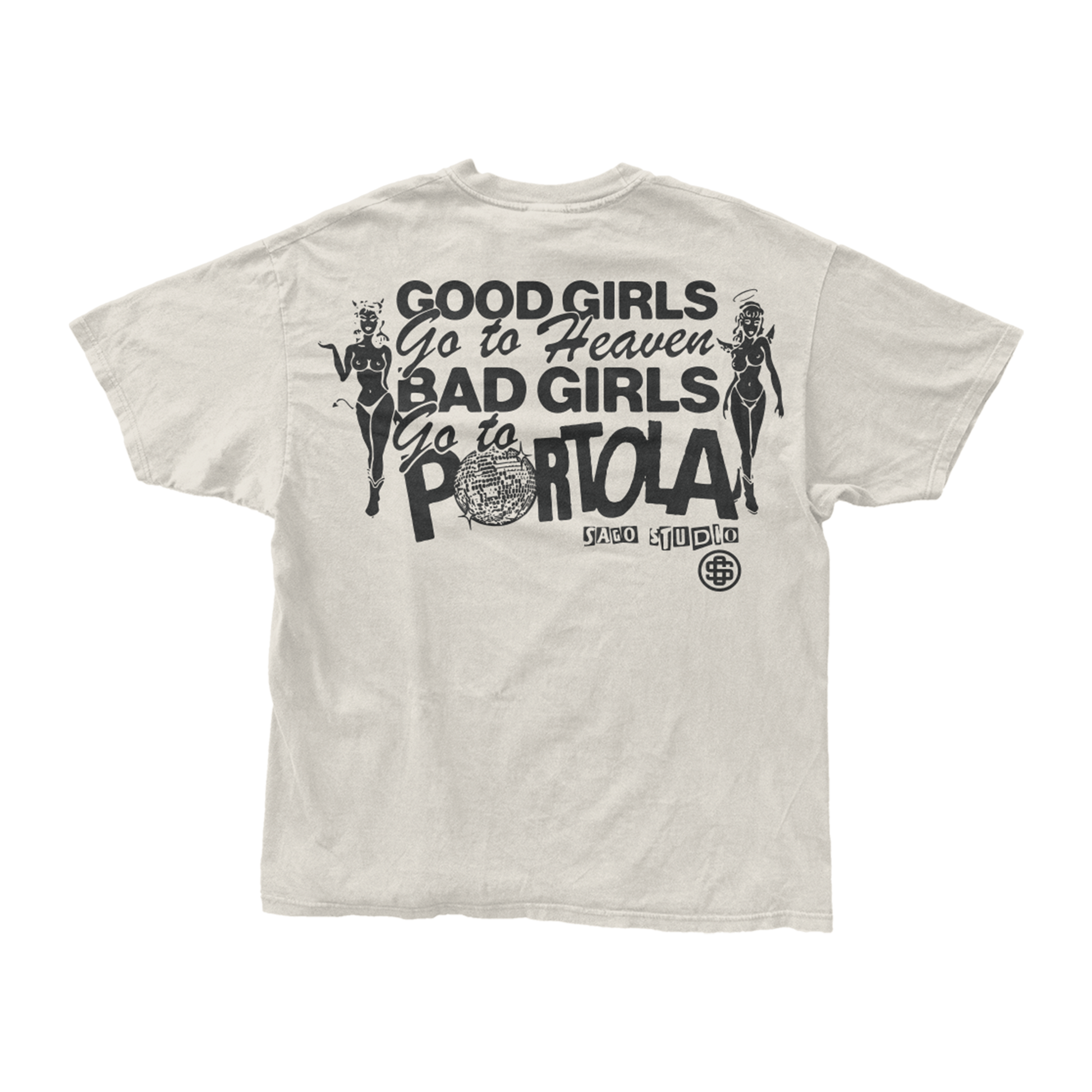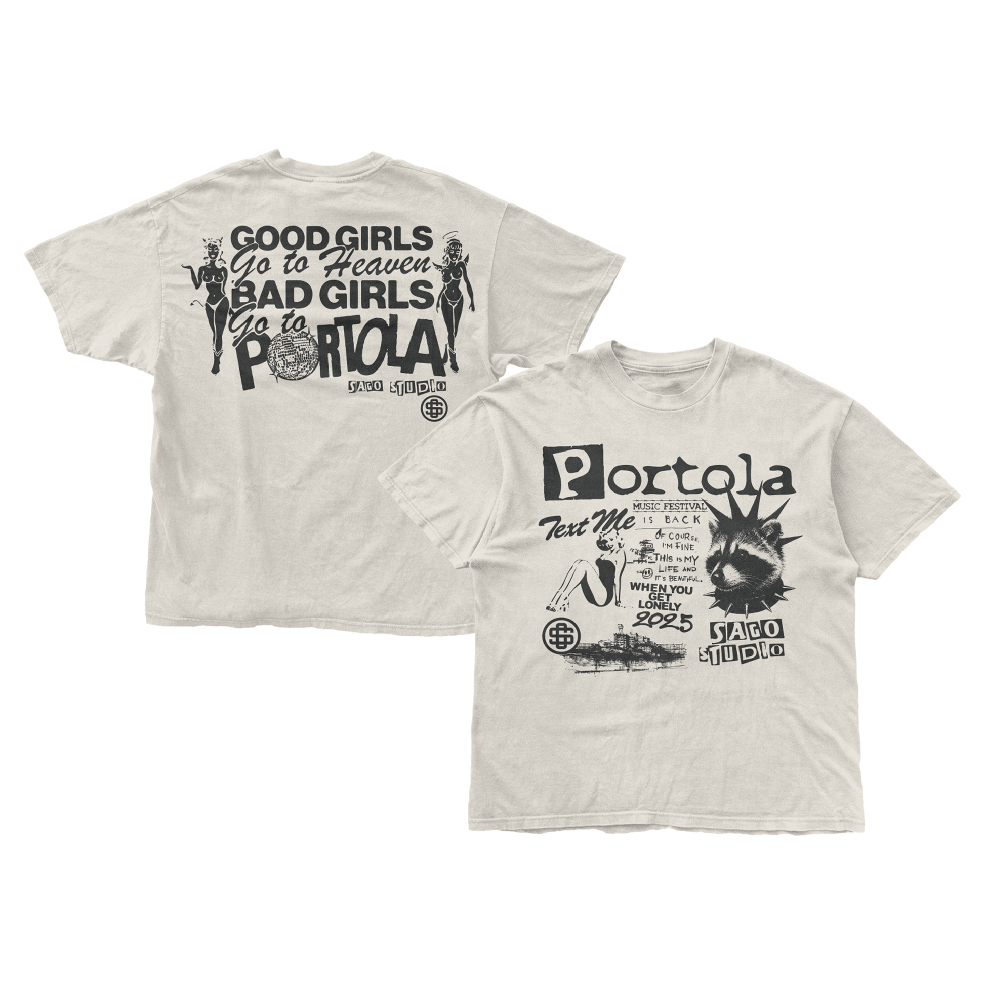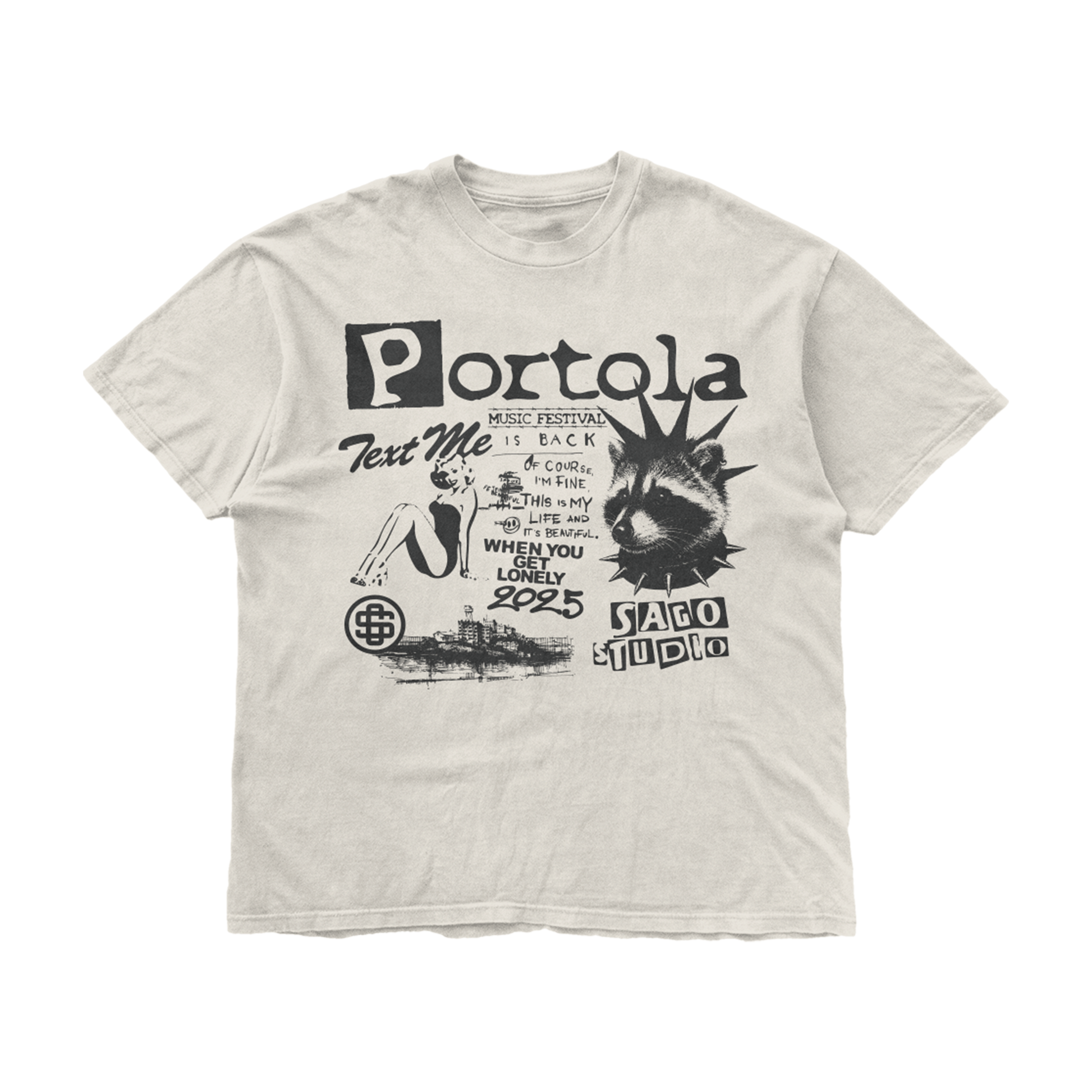 Heavyweight tee in natural, featuring original artwork by Sago Studios printed on the front and back. 100% Cotton. Unisex, relaxed fit.