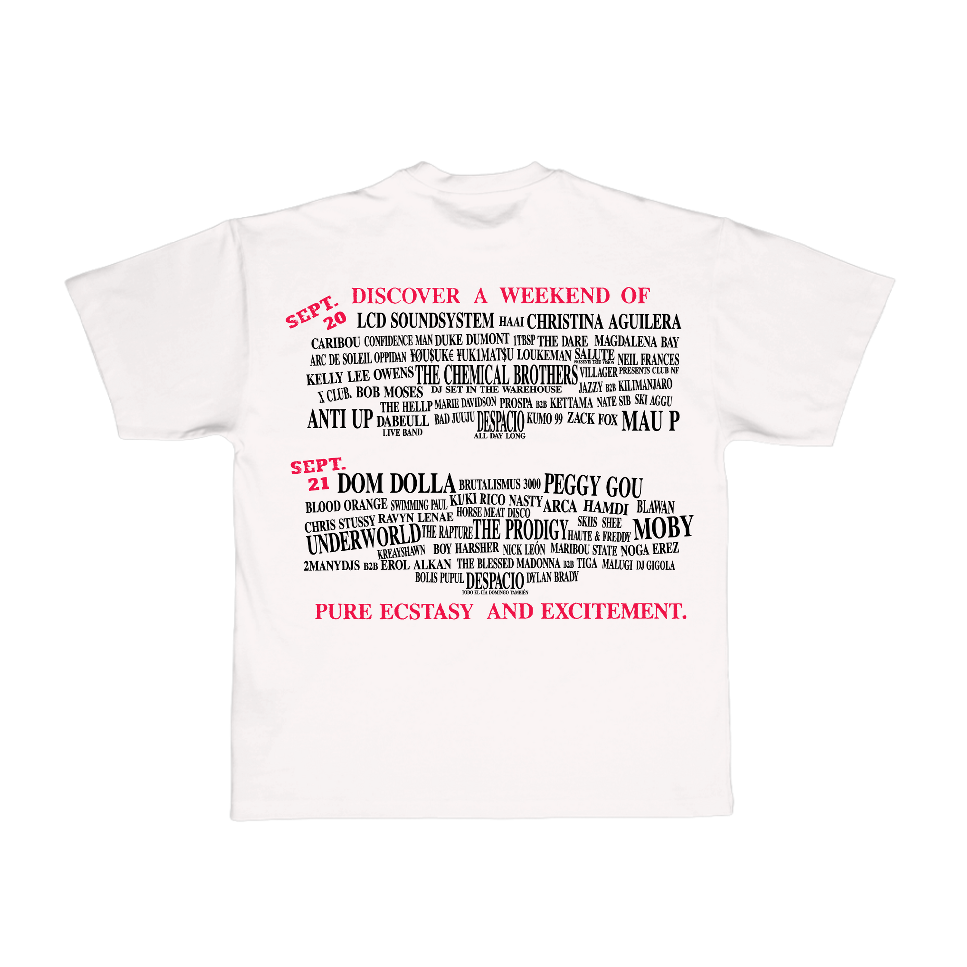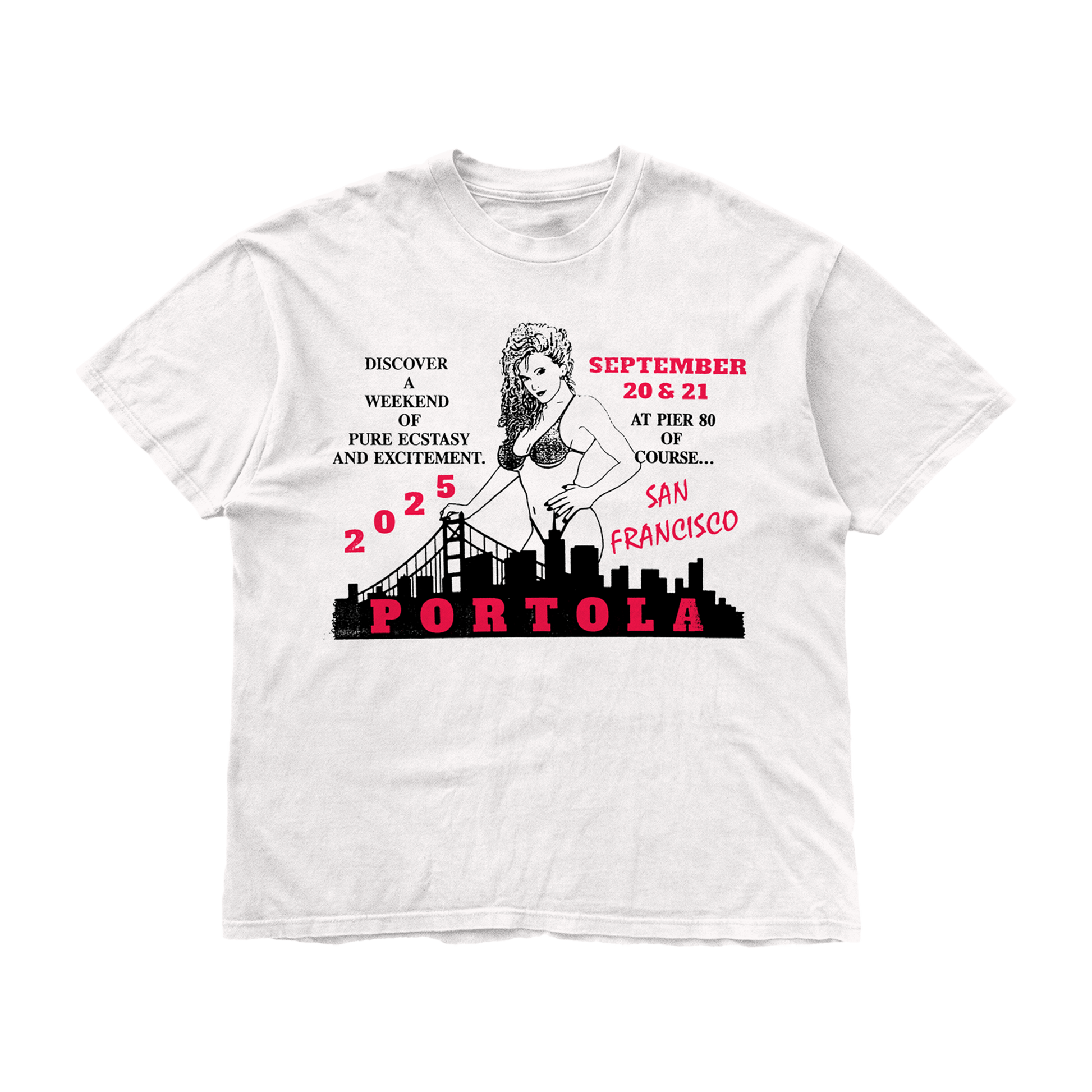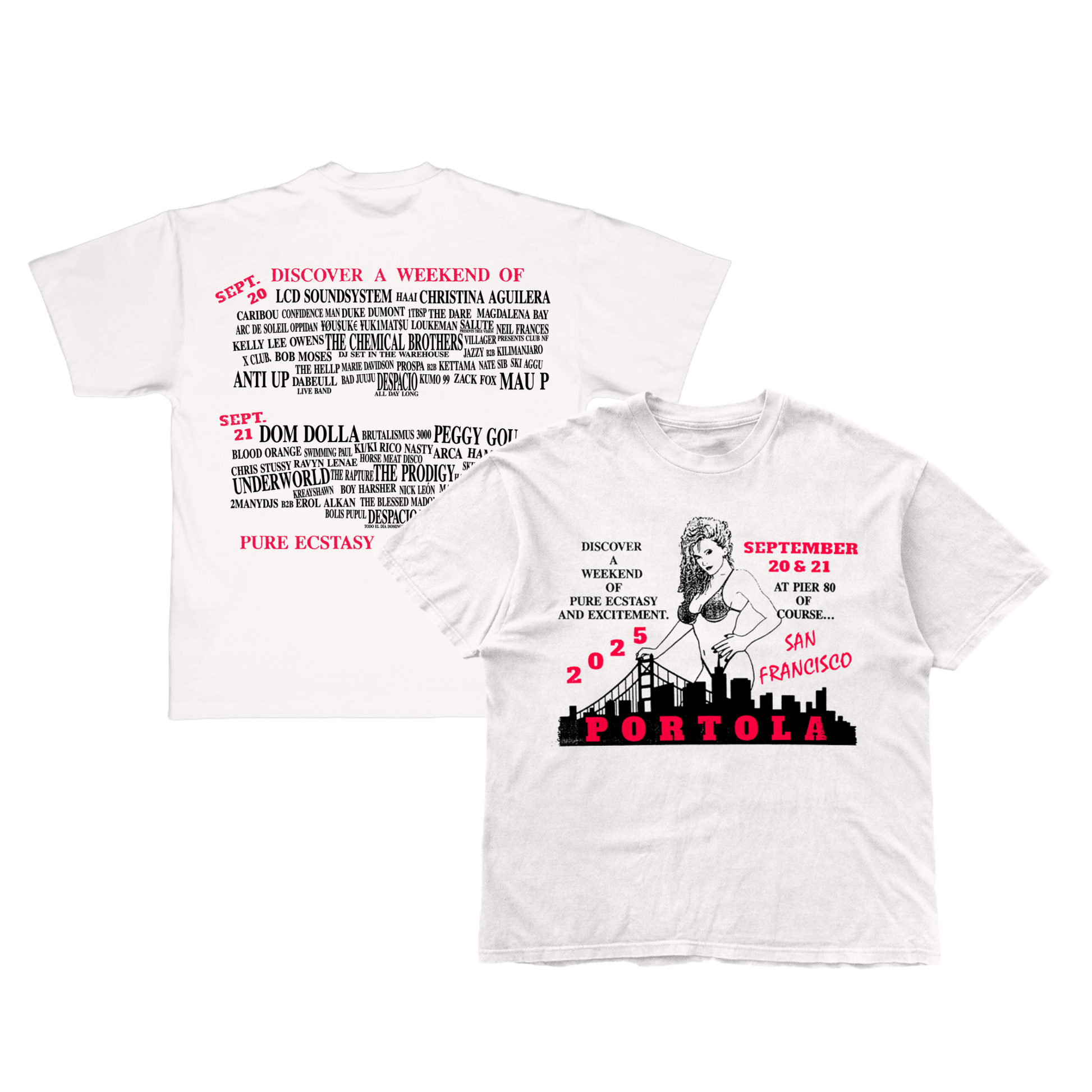 Heavyweight tee in white, featuring Pure Ecstasy logo art printed on the front and the 2025 Portola lineup printed on the back. 100% Cotton. Unisex, relaxed fit.